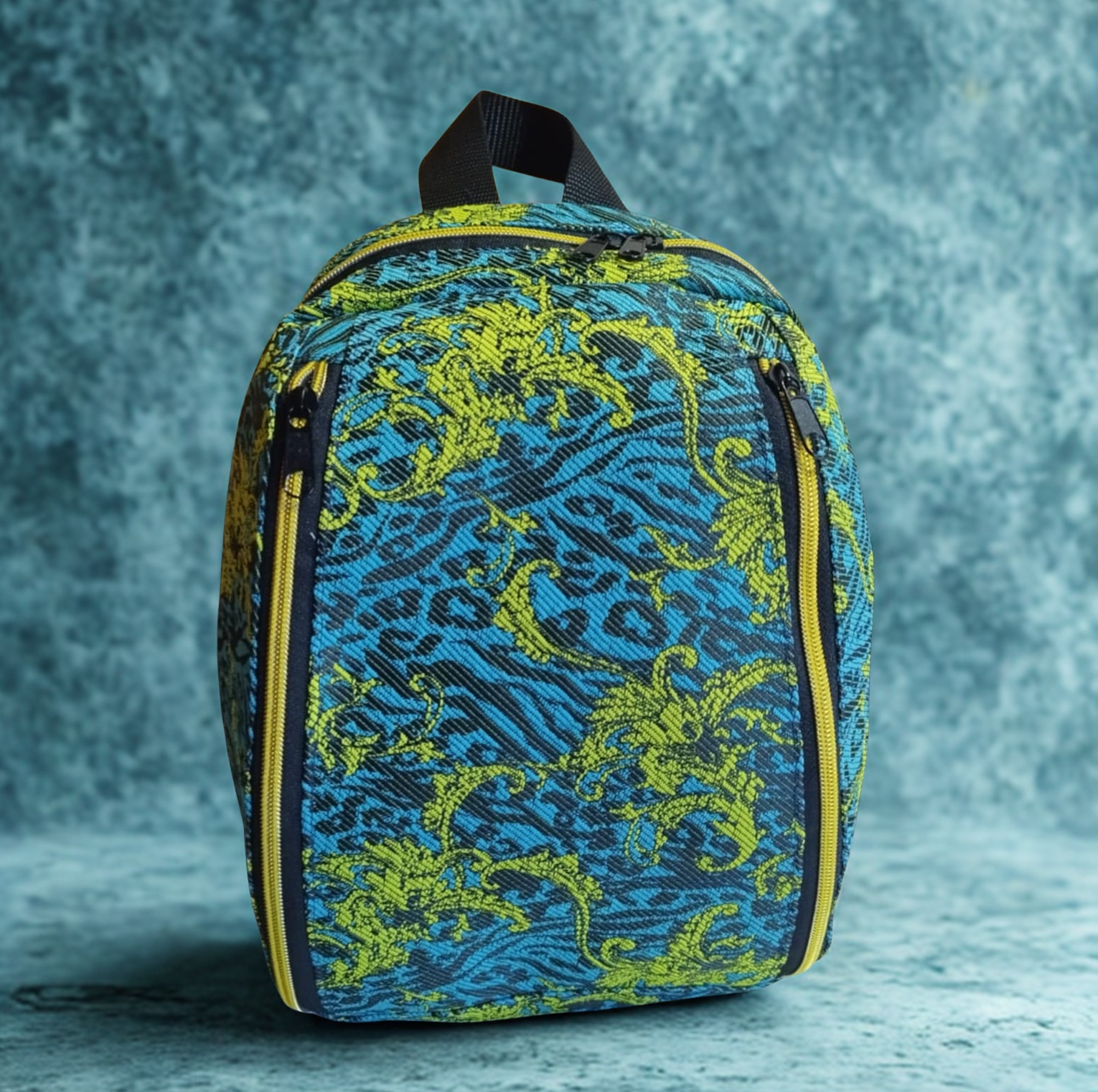 Wyjątkowy plecak uszyty ręcznie z oryginalnej, wzorzystej tkaniny w odcieniach niebieskiego i limonkowej zieleni. Energiczny, odważny design przyciąga wzrok i sprawia, że to nie tylko praktyczny dodatek, ale i modny akcent w stylizacji.