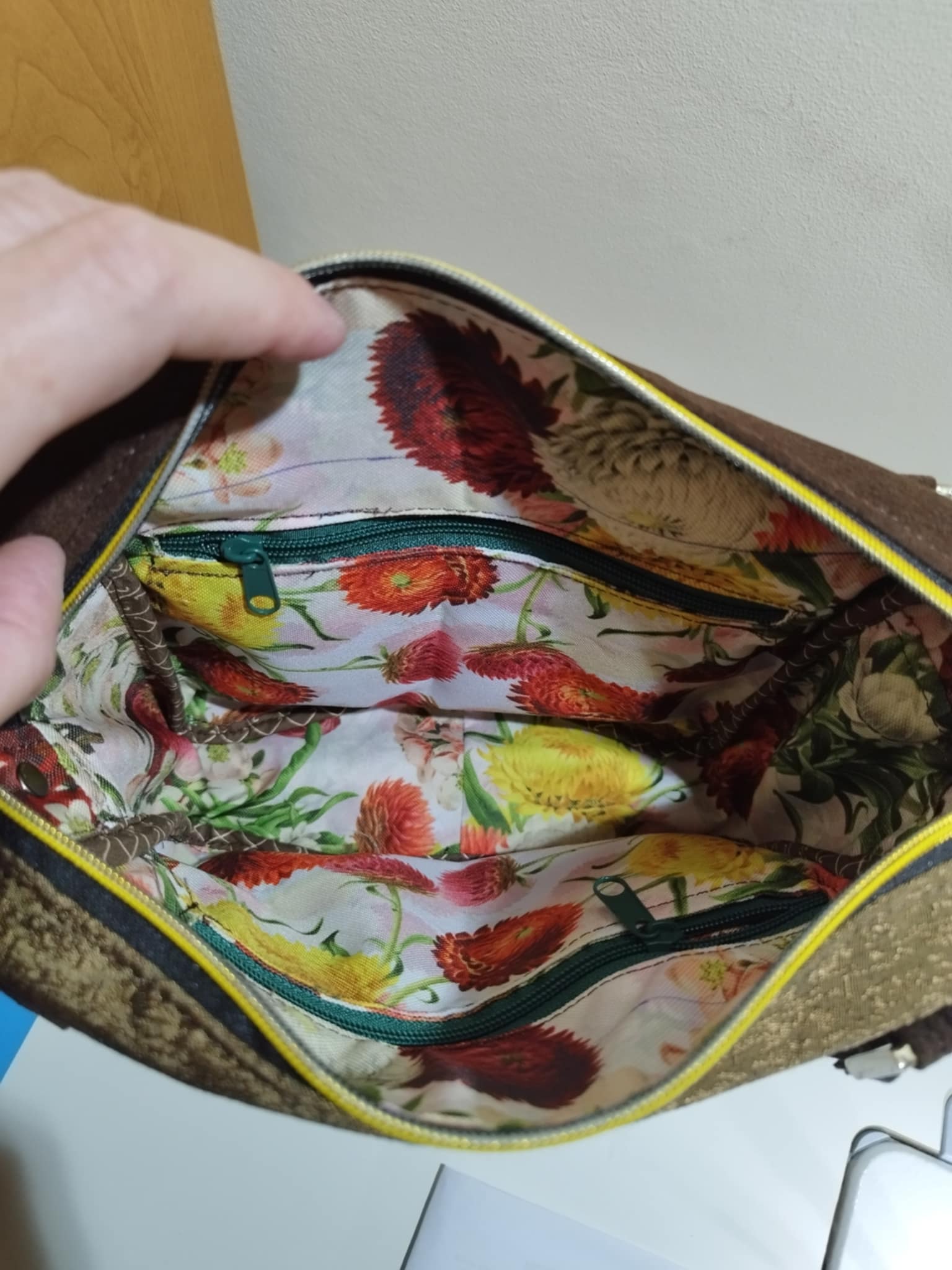 Unikatowa torba na ramię stworzona ręcznie z dbałością o każdy detal. Zewnętrzny materiał w odcieniach brązu i złota nadaje jej elegancki, lekko vintage’owy charakter, a kontrastowy żółty suwak dodaje nowoczesnego akcentu.